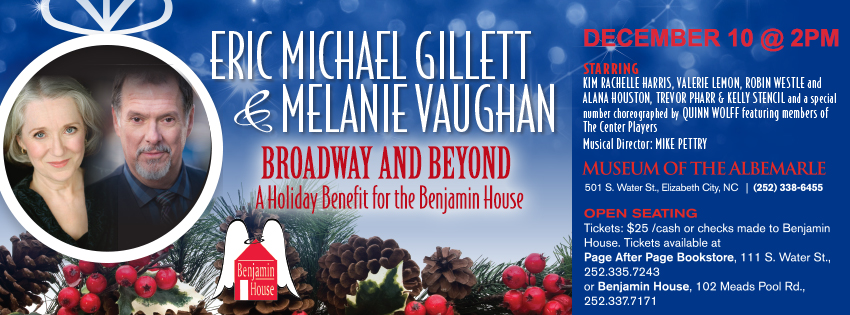 Don't miss this years holiday benefit for the Benjamin House event, Eric Michael Gillett & Melanie Vaugan, Broadway and Beyond! It will be December 10th at 2PM on the Museum of the Albemarle. Tickets are $25 and can be purchased at Page After Page Bookstore, or Benjamin House. We can't wait to see you there!